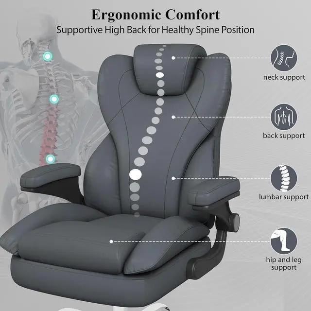 Office Desk Chair, Executive Leather Office Chair, High Back Ergonomic Home Desk Chair with Padded Flip-up Arms, Big and Tall Computer Chair with Rocking Function, 360°Swivel Free, Gray