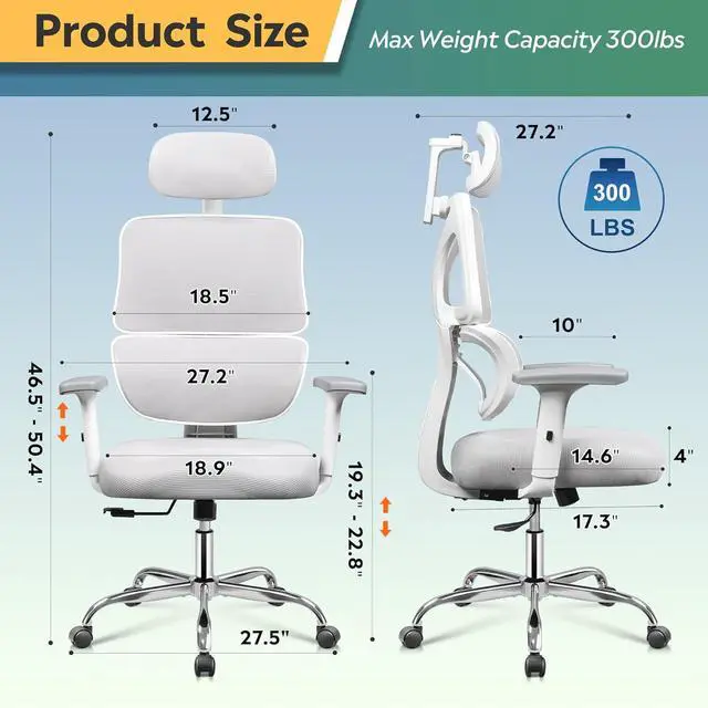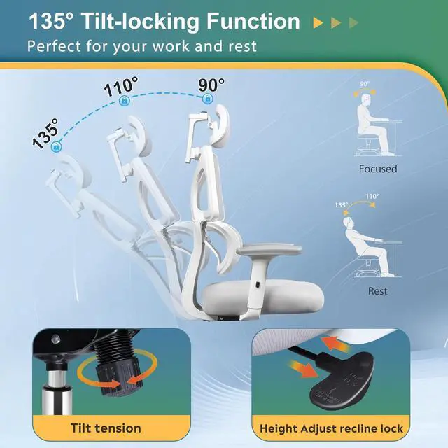 • 3D Adjustable Armrests for Flexibility:The 3D armrests have a unique bounce-back design for easy height and direction adjustments. As the result, this chair is suitable for people of different heights. The seat height ranges from 18.9 to 22.4 inches, while the backrest reclines from 90° to 135°. These adjustments provide customizable seating options to reduce arm strain and maximize workspace efficiency.
