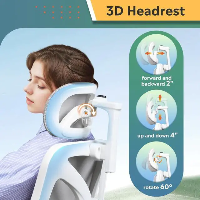 1. Ergonomic Support for Head, Neck, Lumbar, and Arms:This office chair features an ergonomic backrest and a 60° adjustable headrest that contours to your neck for precise support. The adaptive lumbar support prevents lower back strain and injuries, optimizing posture to reduce neck and back fatigue. Stay comfortable and productive even during long work hours.