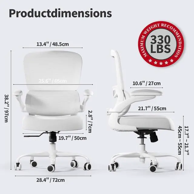 Comfortable Breathable Mesh Seat: This office chair offers a spacious seating area. It can support up to 330 lbs. Its unique recline fnction allows you to tilt the backrest (90~120°) or sit upright freely