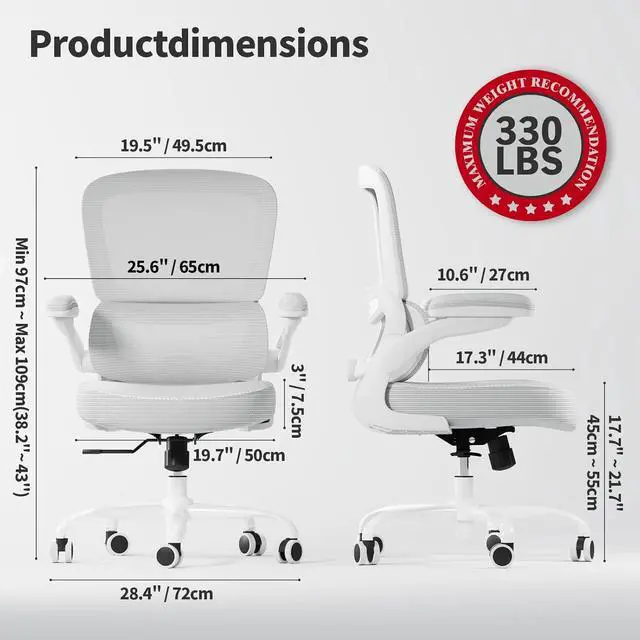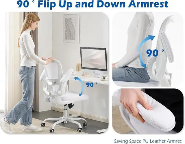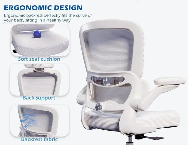 ERGONOMIC SUPPORT: TRALT ergonomic office chair for back pain relief is a desk chair comfy enough for long hours, featuring adjustable lumbar support to promote natural posture. A wider seat (20" W x 17.3" D x 18.5"-21.3" H) helps distribute weight evenly, suitable for people of about 5'5" to 6'2". Flip-up armrests make it a comfy chair for small spaces