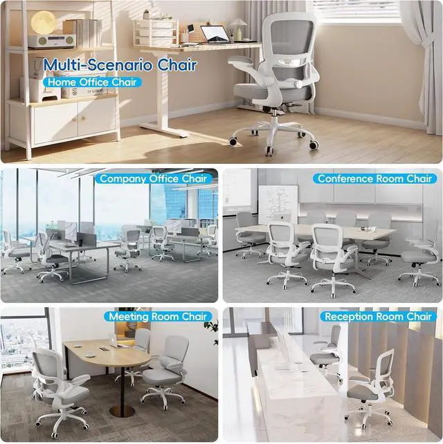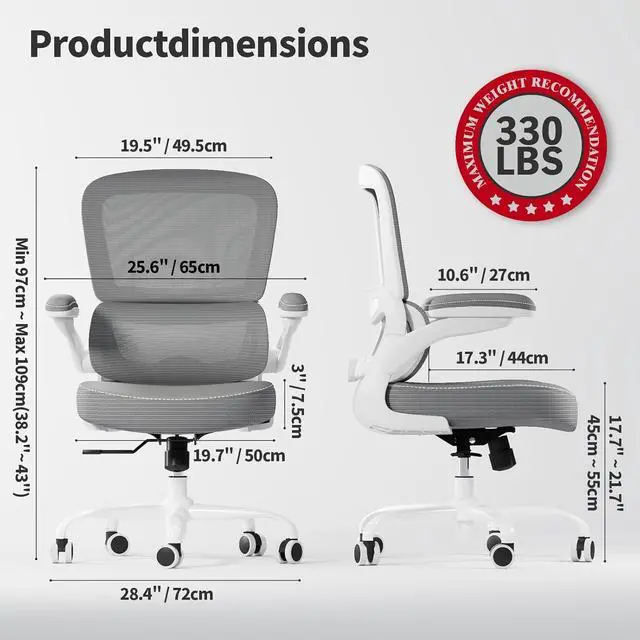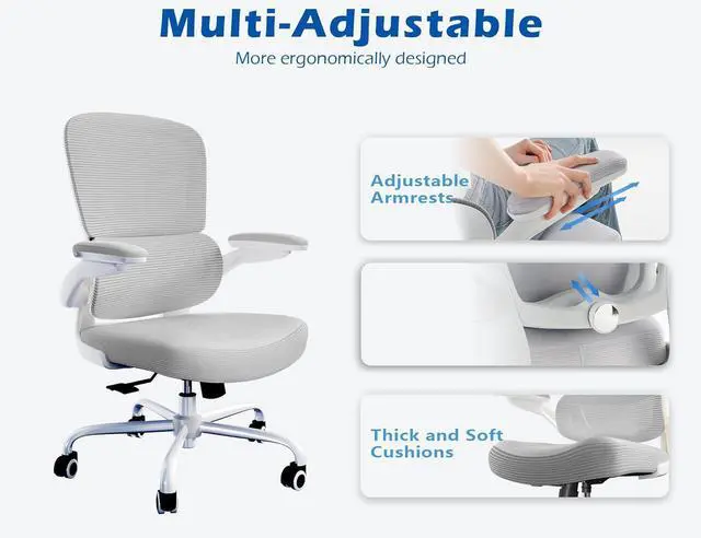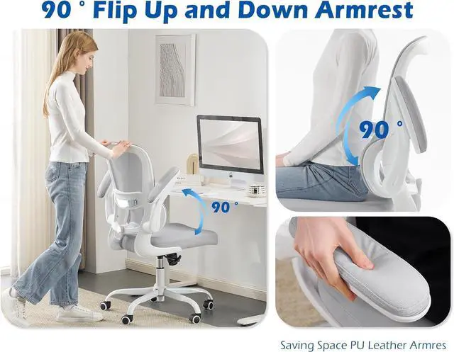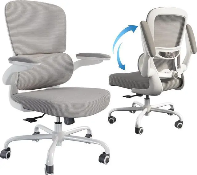ERGONOMIC SUPPORT: TRALT ergonomic office chair for back pain relief is a desk chair comfy enough for long hours, featuring adjustable lumbar support to promote natural posture. A wider seat (20" W x 17.3" D x 18.5"-21.3" H) helps distribute weight evenly, suitable for people of about 5'5" to 6'2". Flip-up armrests make it a comfy chair for small spaces