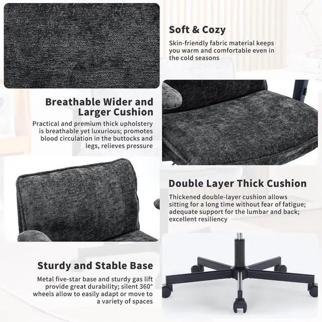 ULTIMATE COMFORT & SOFTNESS Crafted from premium skin-friendly fabric and high-resilience foam, this cross legged office chair prevents deformation for all-day comfort. Sink into the generously padded cushion and backrest for a cloud-like experience. The robust metal base and reliable gas lift ensure the criss cross chairs stability and longevity. A lovely, wide office chair perfect for work, leisure, makeup, studying, or reading