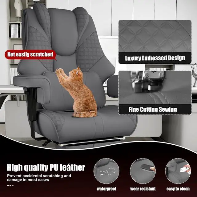 Luxury ComfortThis office chair features an extra-thick 6.3-inch molded foam cushion, providing deeper support and better comfort than standard office chairs. Made with the same craftsmanship as luxury car seats, the high-resilience sponge retains its shape over time and resists sagging, offering lasting comfort throughout long workdays. This leather office chair boasts a deluxe embossing pattern and is upholstered in durable materials, enhancing both its aesthetic appeal and longevity.