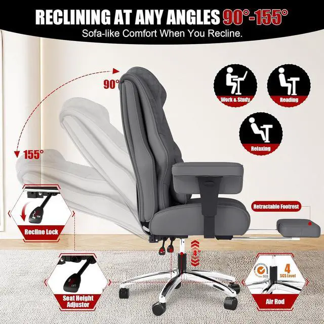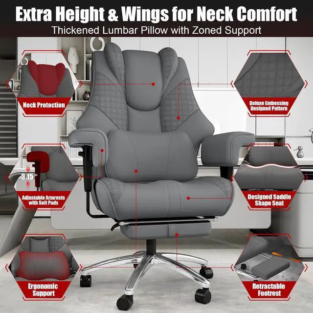 600lbs Big and Tall Office Chair, Wide Ergonomic Leather Executive Chair for Heavy People with Foot Rest, High-Back Reclining Computer Chair with Swivel Wheels and Lumbar Support (Gray)