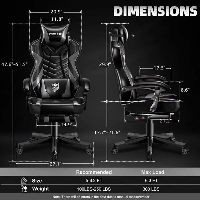 Vonesse Gaming Chair, Big and Tall Gaming Chair with Footrest and Massage, Gaming Chairs for Adults with Lumbar Support, Ergonomic High Back Computer Chair with Pocket Spring Cushion (Grey/Black)
