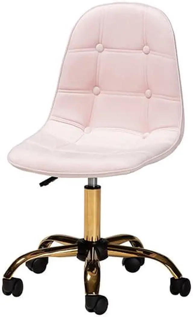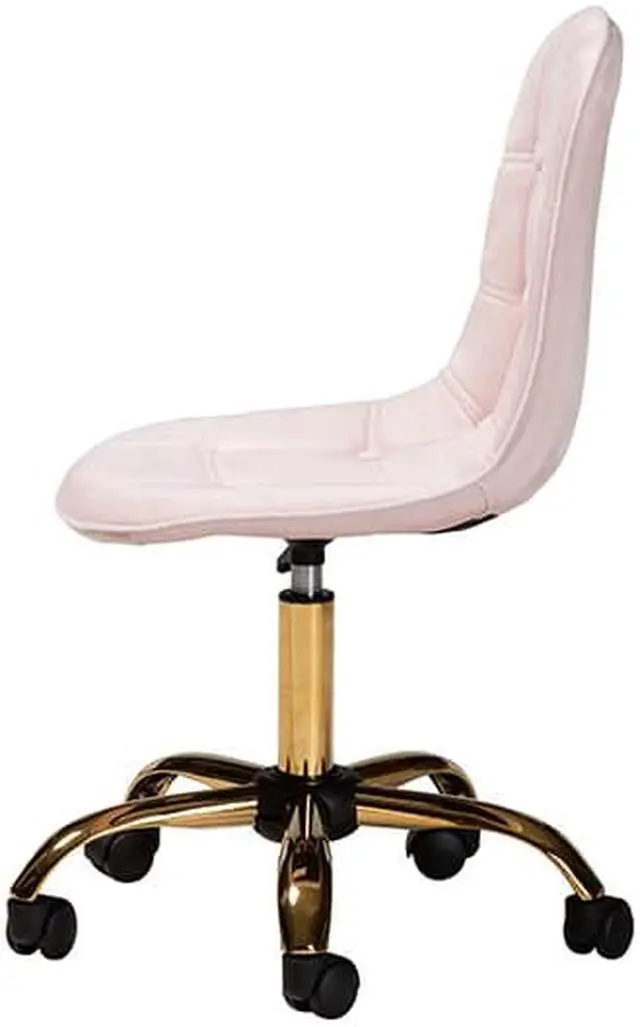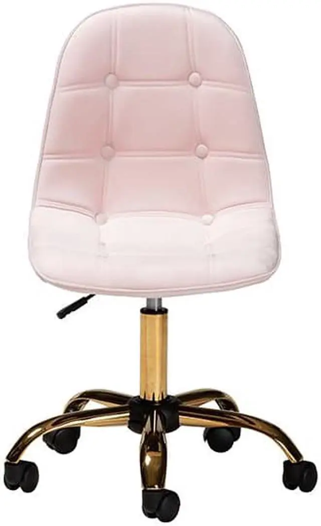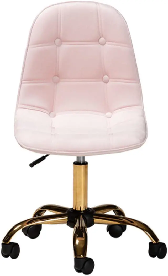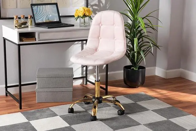 Uplift the style of your home office with the charming Kabira office chair. Made in China, this stunning piece consists of a solid metal base topped with an enticing velvet fabric upholstered seat. Button tufted accents exude graceful personality, while the rounded silhouette presents an inviting display. The Kabira requires assembly and features caster wheels for superb mobility. 360-degree swivel capability and adjustable height conveniently accommodate your needs, making the Kabira office chair a wonderful addition to any home office.