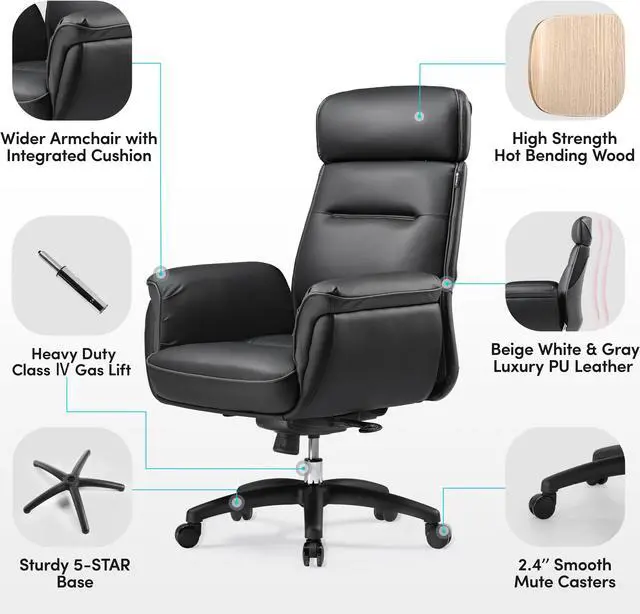 [ Heavy Duty & Luxury ] - Safest Class anti-explosion gas lift, solid nylon 5-STAR base, thickened robust steel chassis & 2.4 ''large mute wheels supports up to 300 LBS weight; Black & Dark Gray Luxury PU Leather Armchair fits with game room & workplaces