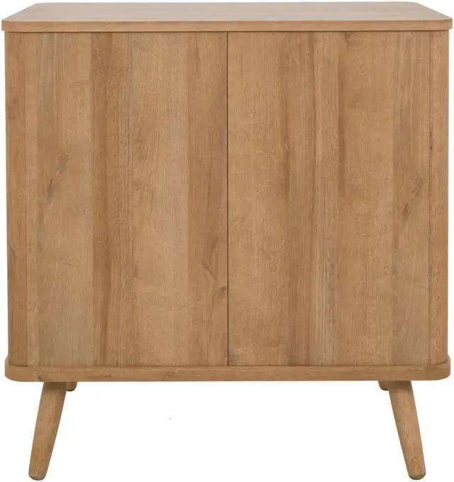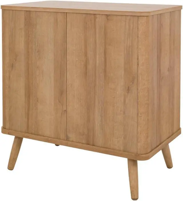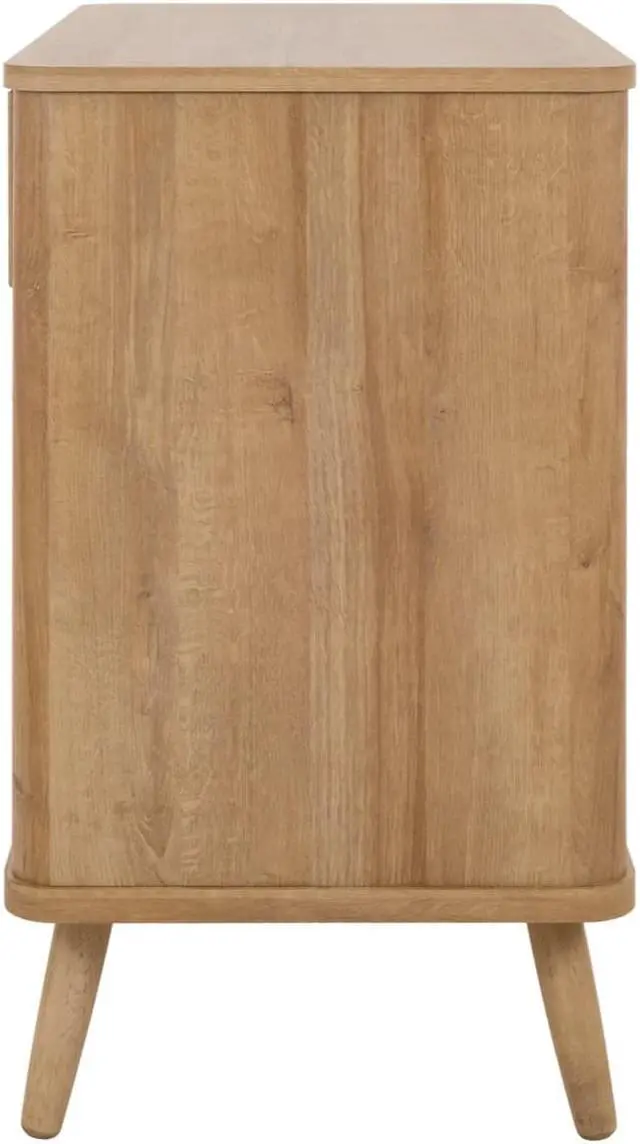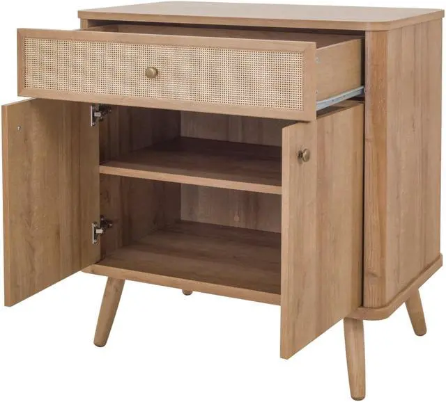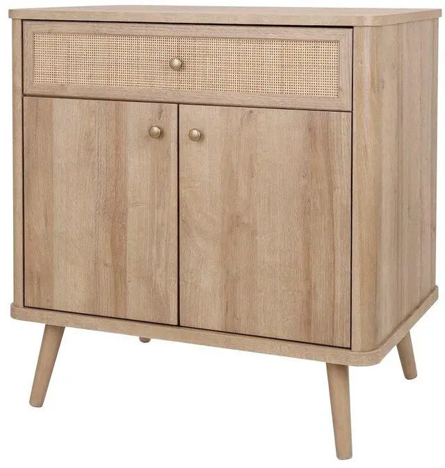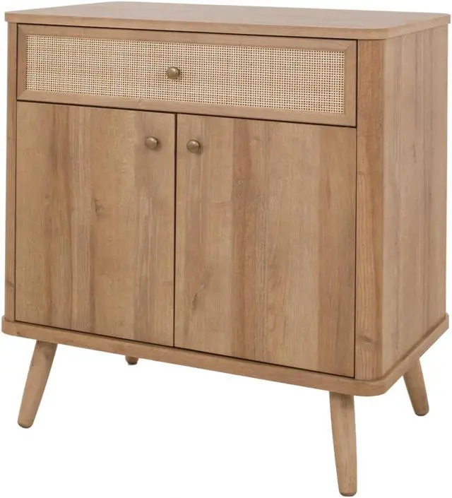 With its simple and sleek, rounded edges, the Thelma collection offers retro styling with Nordic modern vibe. The 31-inch-wide is a go-anywhere storage solution thats sized right for small-space living. It performs in the dining room as a buffet, or even the family room as a media console. The drawer and door fronts are a mix of rattan and printed veneer, a design treatment that gives the case its Modernist appeal. Tapered legs are solid Mahogany wood. Some assembly required.