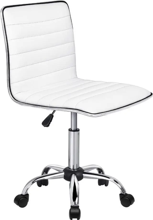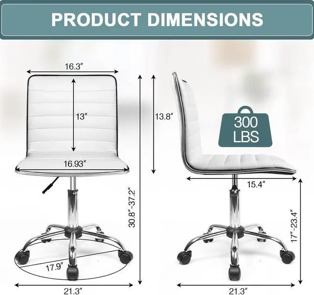 BIFMA certified armless office chair with 5-star leg base and 360 degree swivel wheels,running smoothly on floor . Adjustable seat height: 17.0 inches -23.4 inches;seating area dimension: 15.4 inches x 16.9 inches (W X D);backrest dimension: 16.9 inches x 13.8 inches (W X H).