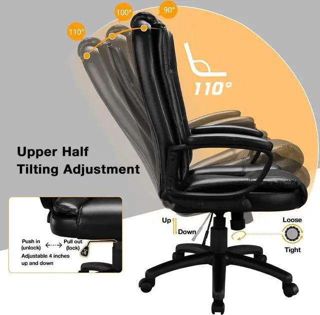 • This Chair has a Heavy duty nylon wheelbase, 4 inches height adjustable and 360° rolling wheels on our home office chair are flexible and suitable for your office environment. The tilt function with position lock and 110° back adjustment, SAFE AND COMFORT, are ready for your office rest, perfect for home, office and boss desk!