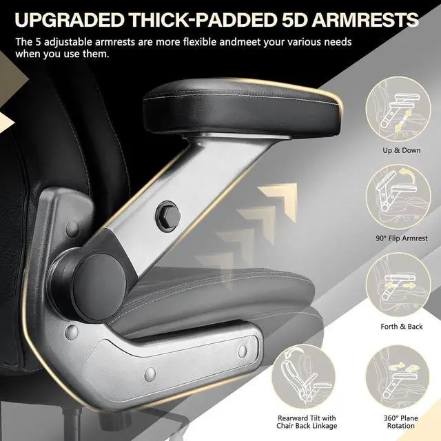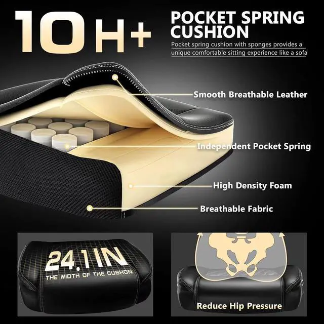 Our executive office chair is equipped with a spring cushion to reduce hip pressure. The extra-wide chair backrest and independent lumbar support gently wraps your body and supports your lower back, thoughtfully designed to keep you comfortable during long hours of working, studying or gaming.