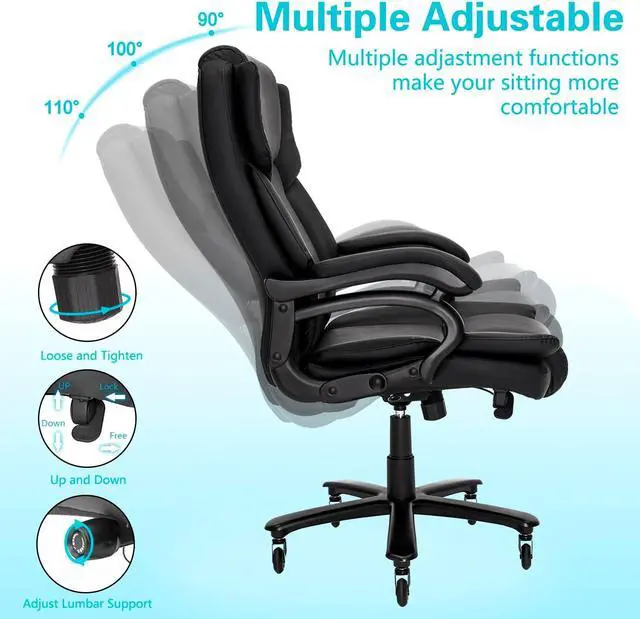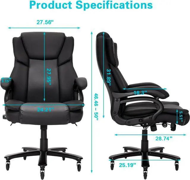 This executive office chair is equipped with a double layer sponge cushion to ensure comfort and support. The extra-wide chair backrest and independent lumbar support gently wraps your body and supports your lower back, thoughtfully designed to keep you comfortable during long hours of working, studying or gaming.