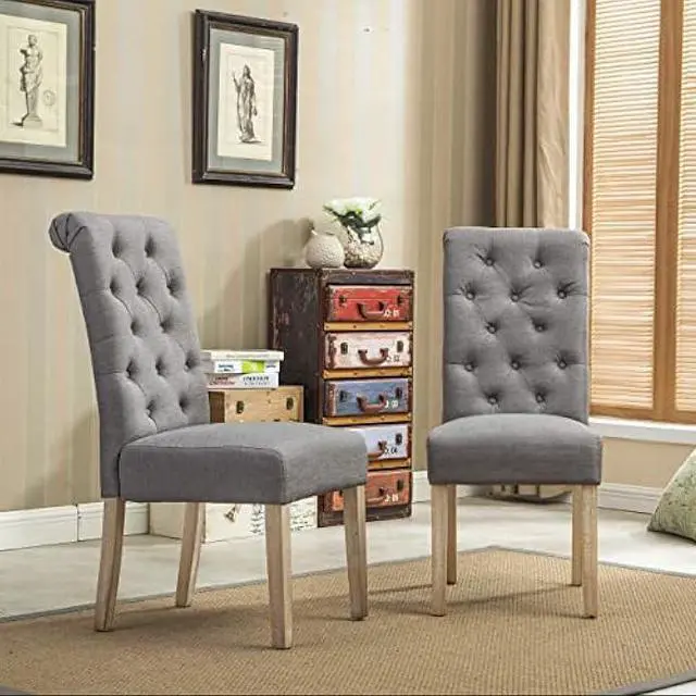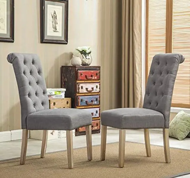 Simply elegant, the Habit Gray Solid Wood Tufted Parsons Dining Chair has a style fit for royalty. This dining chair is upholstered in your choice of color perfectly accented with button tufting.