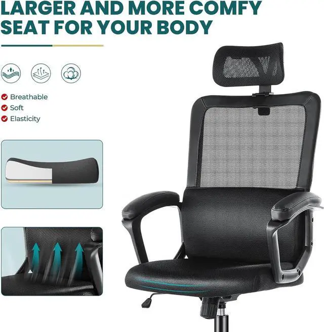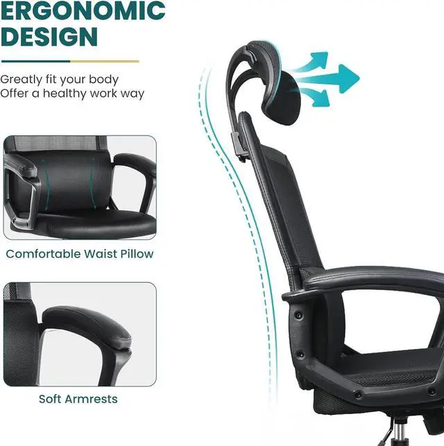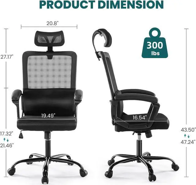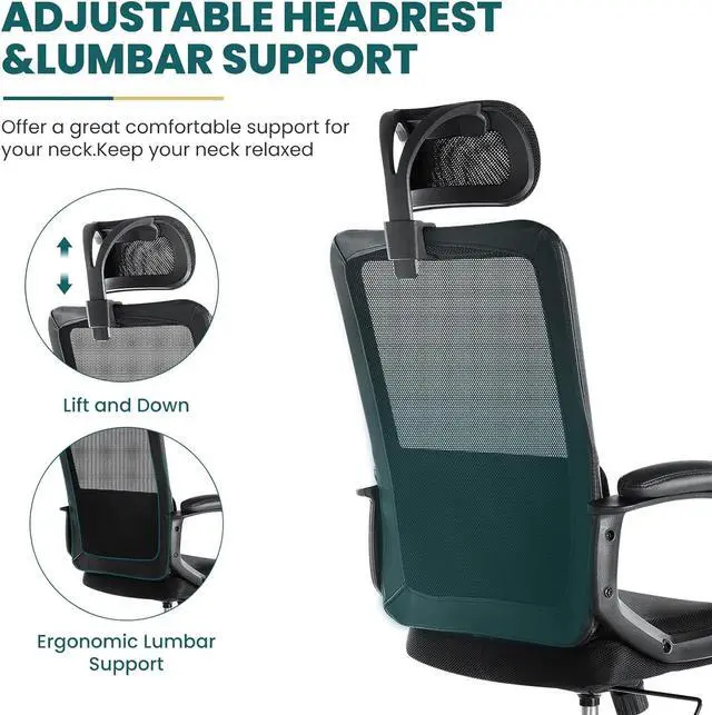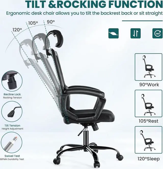Ergonomic Lumbar SupportThe office desk chair with an ergonomic high back to accommodate the natural curvature of the spine, providing maximum support for your lumbar and shoulders. The 90°-120° tilt is designed to meet your relaxation needs with added comfort for all-day sitting. The mesh backrest is highly breathable.