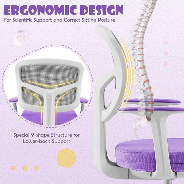 Ergonomic Design Urges Right Posture: This kids' task chair has a back with Y-shaped lumbar support and a deep seat to reduce the fatigue caused by long sitting and studying. It also encourages the kids to form the right sitting posture. Besides, the armrests give extra support to the body.