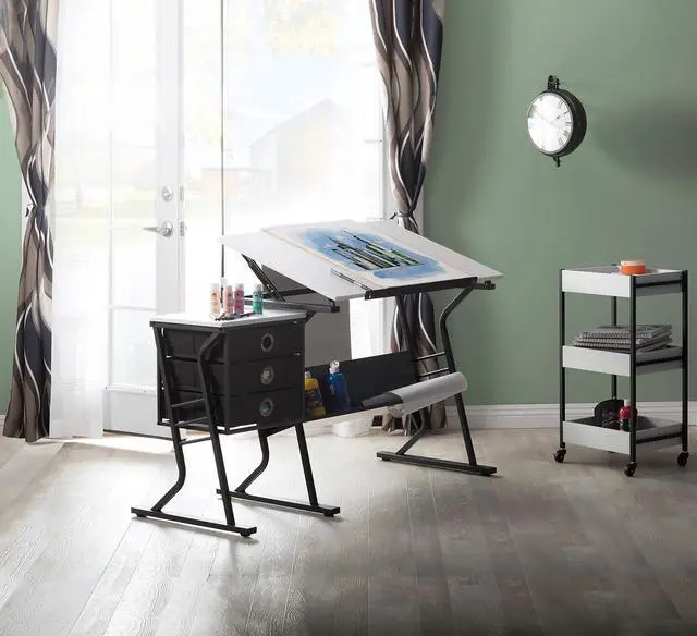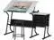 The Eclipse Ultra Drafting Center by Studio Designs provides a comfortable work space and keeps your supplies easily accessible. The artist table top is adjustable up to 40 degrees and Includes a 24pencil ledge that slides up and locks into place when needed. The table and stool set also features three adjacent storage drawers. The durable heavy gauge steel construction Includes six floor levelers for stability.