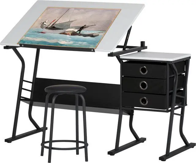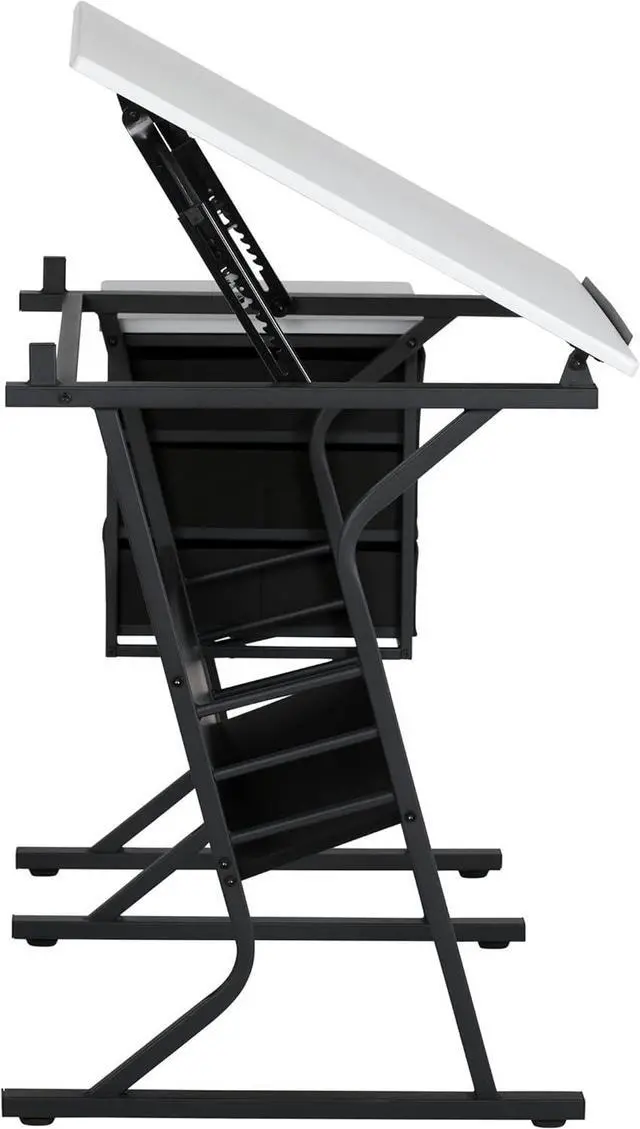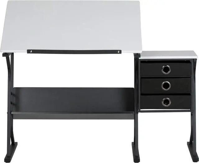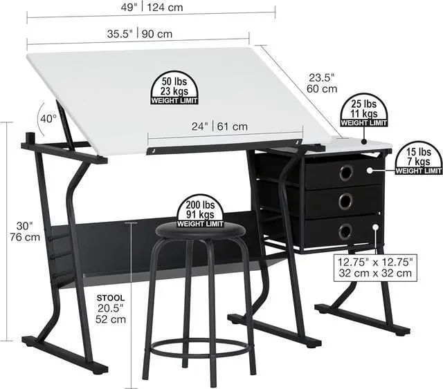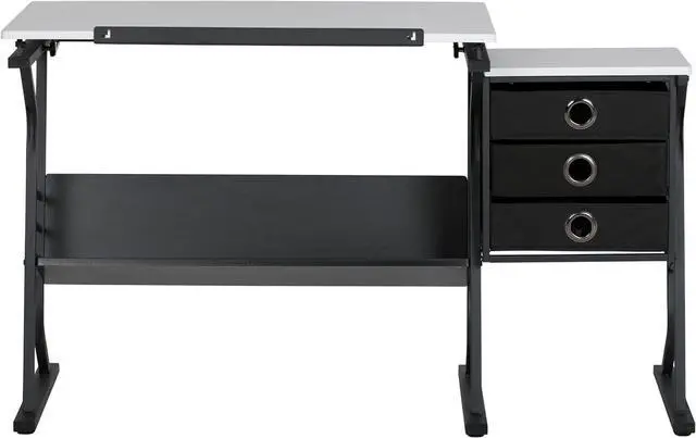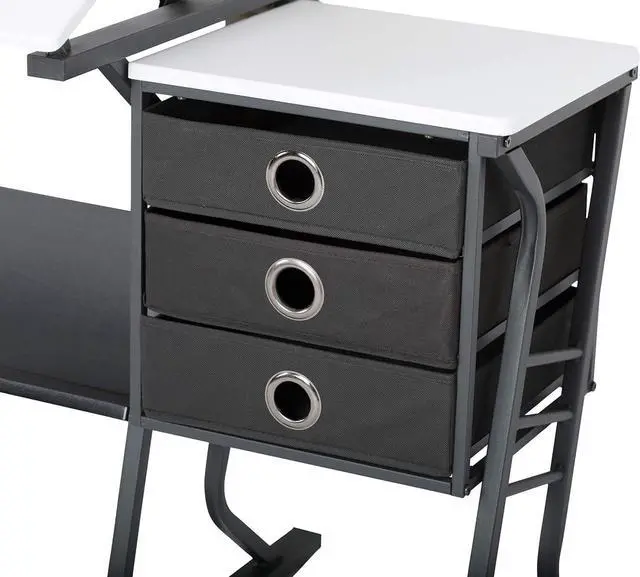 STORAGE: Three 12.75 " W x 12.75 " D fabric drawers can be used to hold and organize papers and lighter tools. The side table top above the drawers offers a flat surface for a laptop or phone while the top is titled. The 32" wide metal storage shelf beneath the table top stores larger, heavier supplies.
