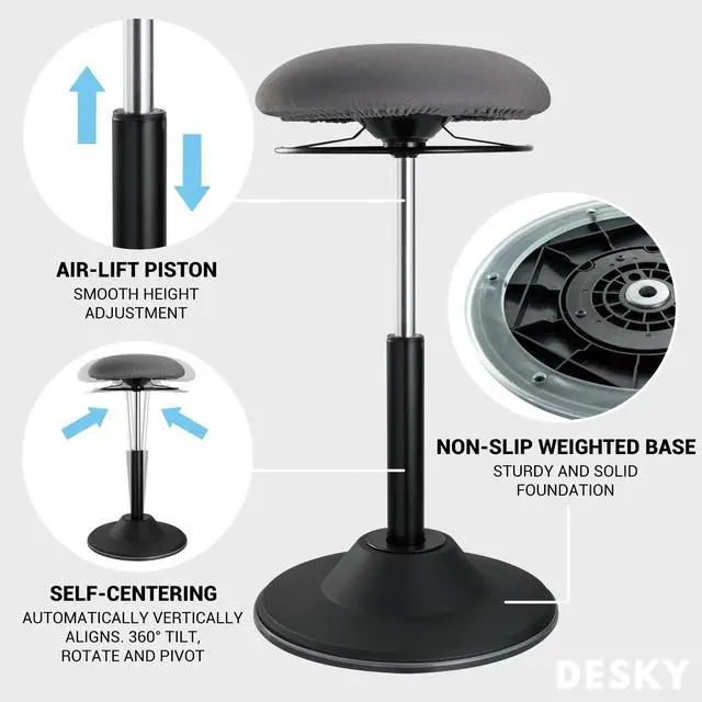 Our wobble stool is the perfect accompaniment to your sit standing desk. It is height adjustable. Allowing for active sitting; you use your core muscles to improve posture, taking the strain off your back muscles and reducing back pain. But adjusted to the correct height, means you can perch, effectively standing and making the most of your sit stand desk. The conveniently placed handle for the air-lift piston mechanism makes for quick seat-height adjustment whilst seated. You can work at a height that allows you to naturally rock, tilt and lean means a more comfortable day in your workspace.