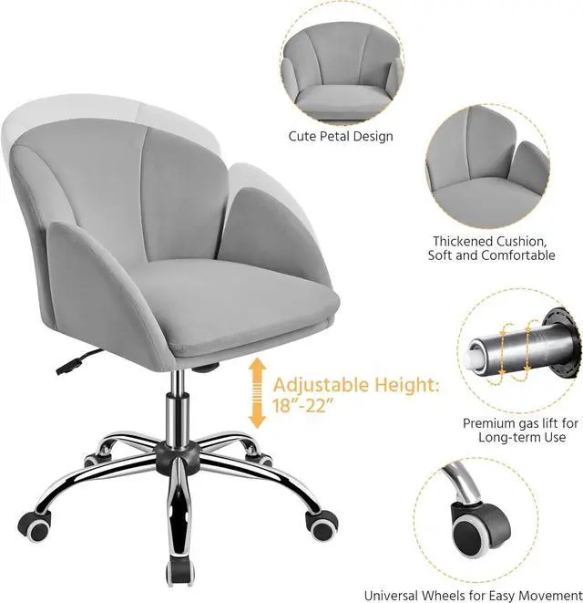 Flower-Shaped Chair Design: Highlighted by the petal-like arm and back design, this gray-toned desk chair stands out with its blooming flower silhouette. Combined with the silky velvet upholstery, this chair adds elegance to anywhere it stands