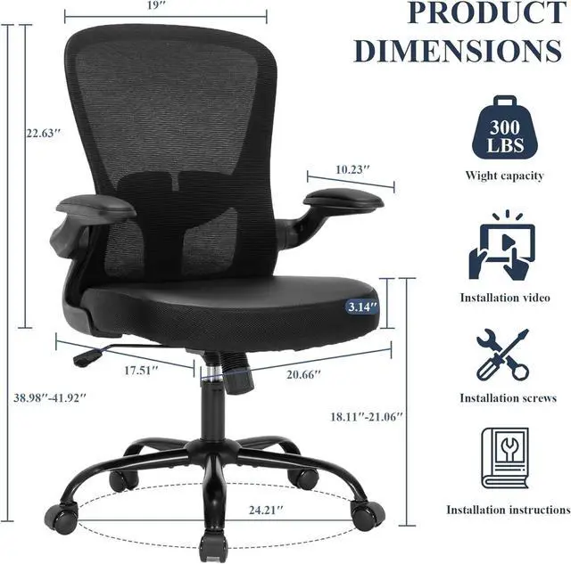 Versatile Mesh Office Chair Featuring flip-up armrests for convenient storage under desks, these office chairs are designed to save space. Smooth-rolling wheels enable easy mobility around the office. The seat height adjusts between 18.11 to 21.06 inches. For relaxation, simply pull the adjustment lever and rotation button to activate rocking mode, with a backrest tilt angle ranging from 90° to 130°