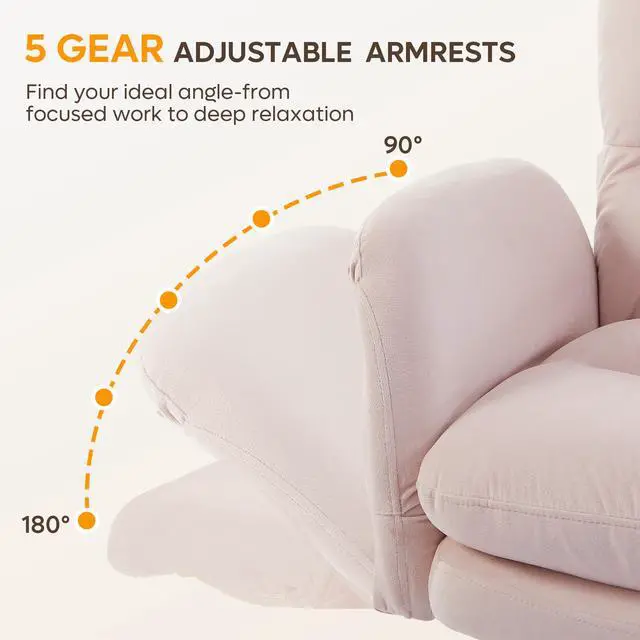 • Adjustable armrests lock into 5 positions (90°180° range); fully extended armrests expand seat width from 21.3 to 40.9, offering ample space for cross-legged seating or cozy moments with pets.