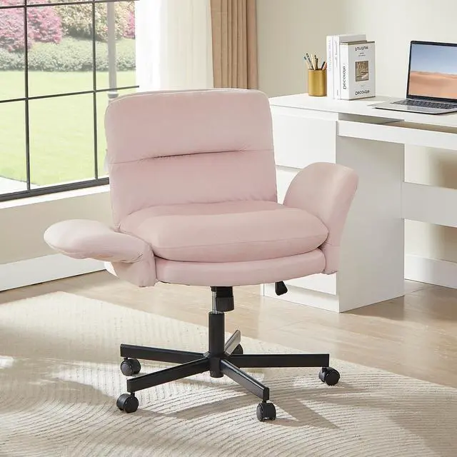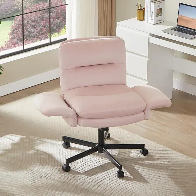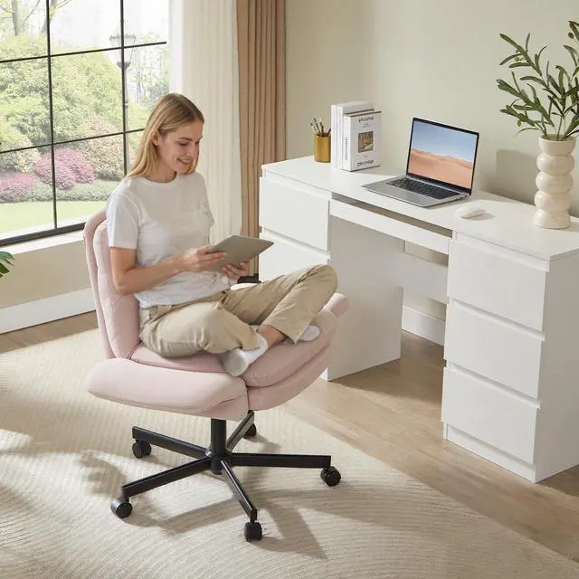 Introducing the Bestier Cross-Legged Office Chairyour go-to for comfort and versatility across work, play, and daily routines. Designed to pair effortlessly with both an office desk and a gaming desk, it adapts to your dynamic needs, whether youre typing up reports, gaming for hours, or getting ready at your vanity. The flip-up arms are a game-changer, letting you sit cross-legged for a relaxed posture during long sessions, while the 360° swivel wheels let you glide smoothly between spaces without hassle. Its thick, supportive cushion ensures comfort from morning to night, and the sturdy criss cross base supports up to 300 pounds for lasting reliability. Measuring 28.74 (W) x 26.77 (D) x 38.19 (H) with adjustable seat height, this chair fits most body types and space sizes, making it a practical addition to any home. Whether youre setting up a home office, upgrading your gaming corner, or needing a cozy vanity chair, it balances functionality and style seamlessly.