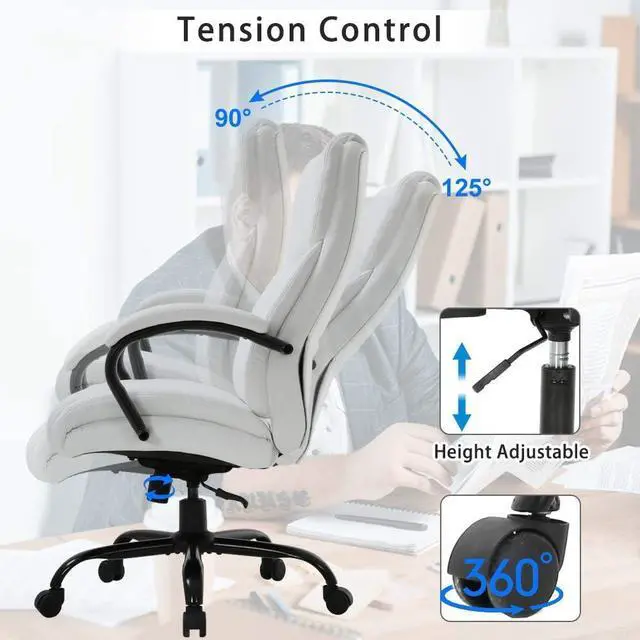 Smooth Tilt and SwivelYou can pull out on the control handle, which allows yours to tilt back sit forward. the big and tall office chair can be reclined from 90 degrees to 120 degrees so that you can find the optimal position to work or rest. And our executive chair can be rotated 360 degrees, with sturdy rolling wheels, it can move easily, and it will not make noise, the computer desk chair is the best helper in your office. big and tall office chair executive chair Ergonomic desk chair