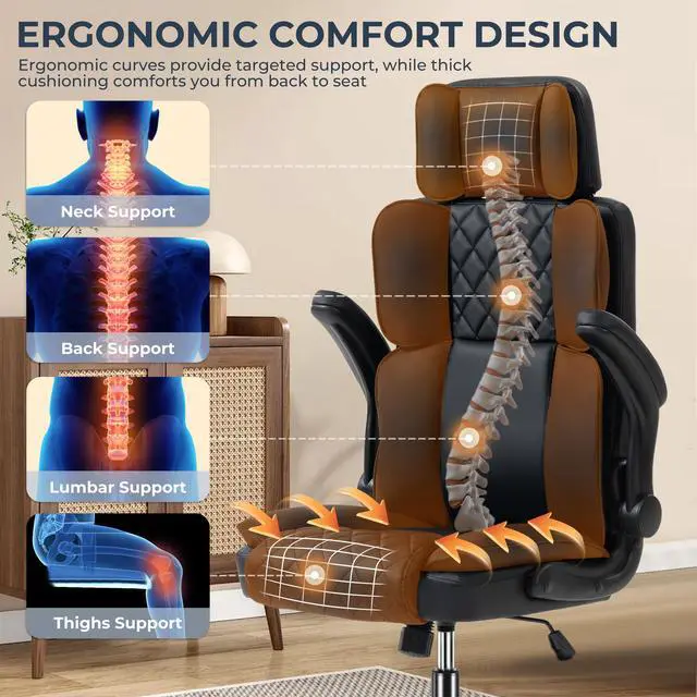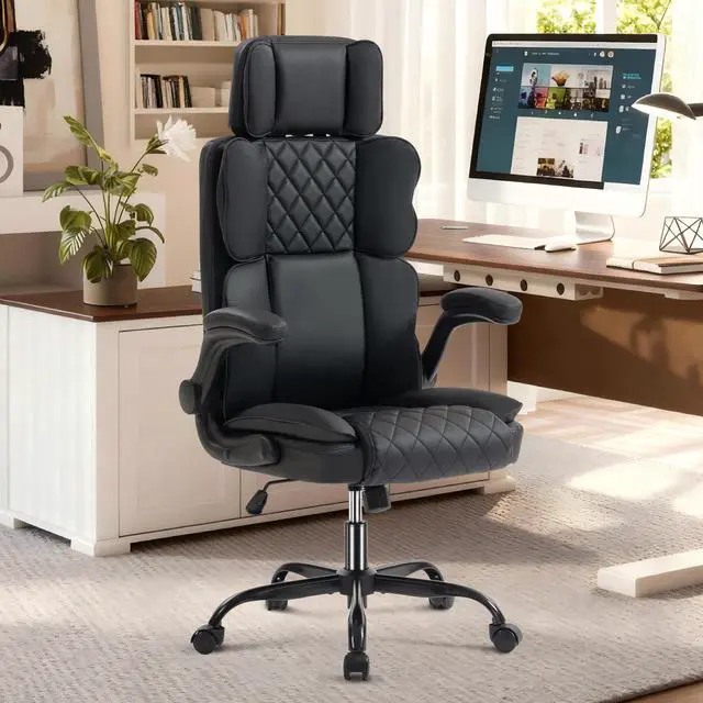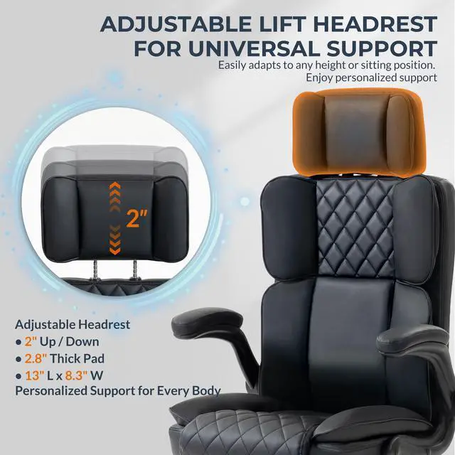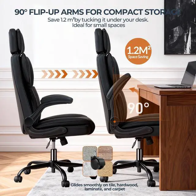 Executive Office Chair with Adjustable Headrest, Leather Home Desk Chairs with Wheels, Thick Padded Flip-up Armrests, Smooth Swivel Rolling, Ergonomic Work Chair for Lower Back Support, Black