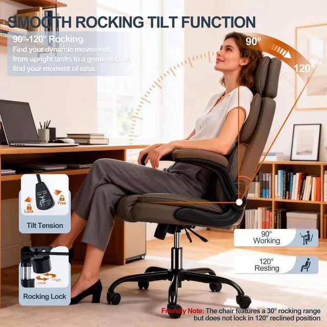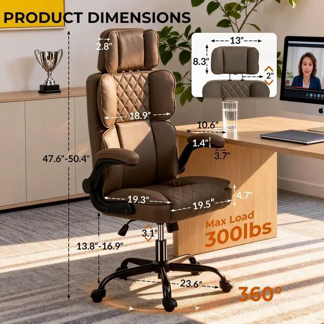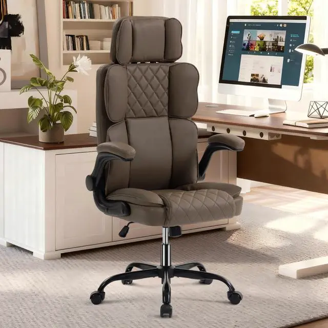 Executive Office Chair with Adjustable Headrest, Leather Home Desk Chairs with Wheels, Thick Padded Flip-up Armrests, Smooth Swivel Rolling, Ergonomic Work Chair for Lower Back Support, Brown