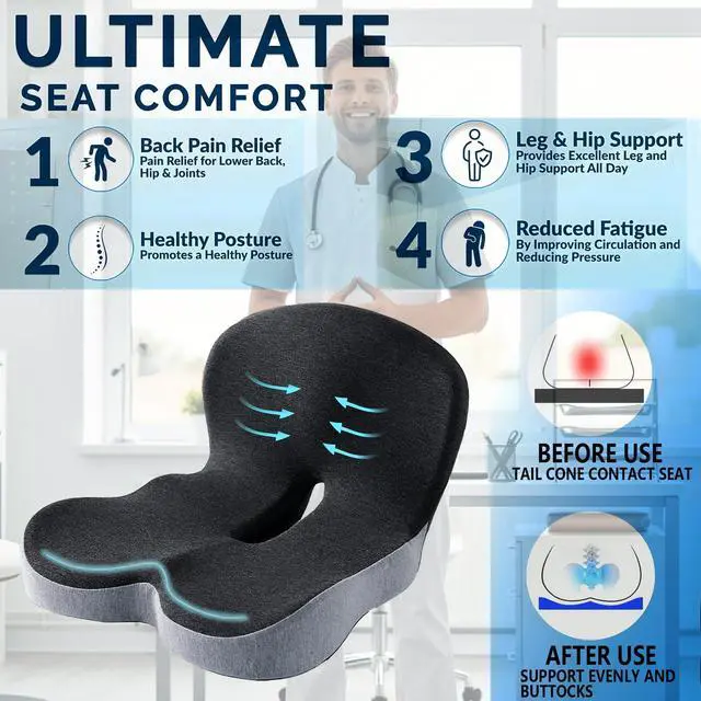 Ultimate Pain Relief & Support: Designed to relieve pressure on your lower back, tailbone, and hips, this ergonomic seat cushion helps reduce discomfort from sciatica, herniated discs, or long sitting hours.