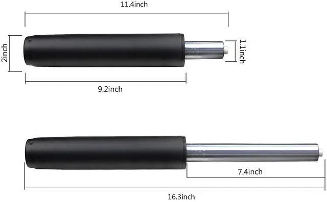 All office chairs have an unique universal size and compatible with all office chairs sold in the USA/Canada. Outer cylinder has 2" in diameter, and the inner cylinder has 1.1" in diameter. Both cylinders' edge are slightly tapered for ease of installation. The cylinder has a minimum length is 11.4" which can be extendable to a maximum length of 16.3". The adjustable range of 5" in between will cover the height needed for most users.
