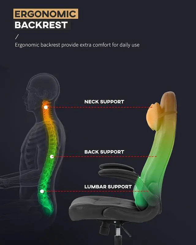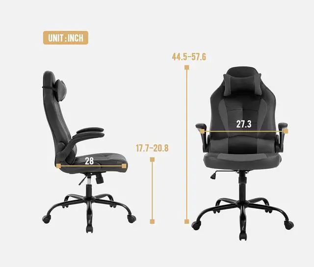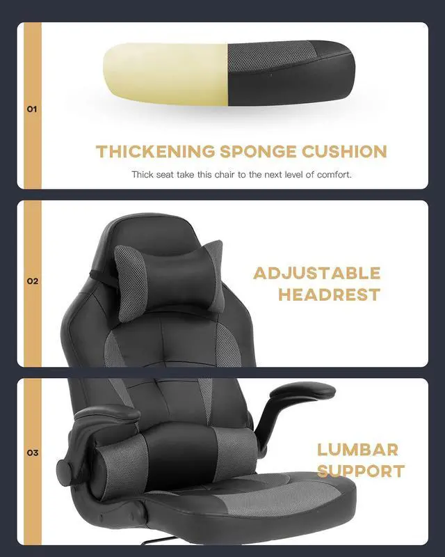 | This ergonomic racing style gaming chair is designed to deliver reliable comfort and support for extended hours of gaming, working, and office use. Featuring a high backrest that supports the entire spinal column, it helps reduce fatigue and discomfort during prolonged sitting sessions. The chair is equipped with a breathable faux leather surface that enhances airflow, paired with a wide cushioned seat for a more relaxed experience. It includes adjustable seat height, a locking backrest, and flip-up armrests to fit different body types and usage preferences, while the rocking function adds flexibility for rest breaks. Built with a heavy-duty five-point metal base, the chair ensures stability and supports up to 250 pounds, suitable for daily adult use. Smooth 360-degree swivel wheels allow easy movement around the workspace, and the included headrest provides extra neck support. With a modern racing design, this chair fits well in home offices, gaming setups, and conference areas, offering a practical and comfortable seating solution for various indoor activities. |