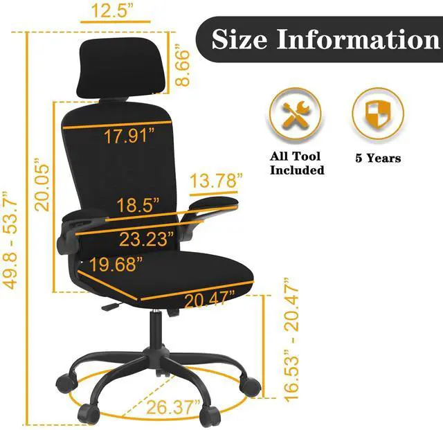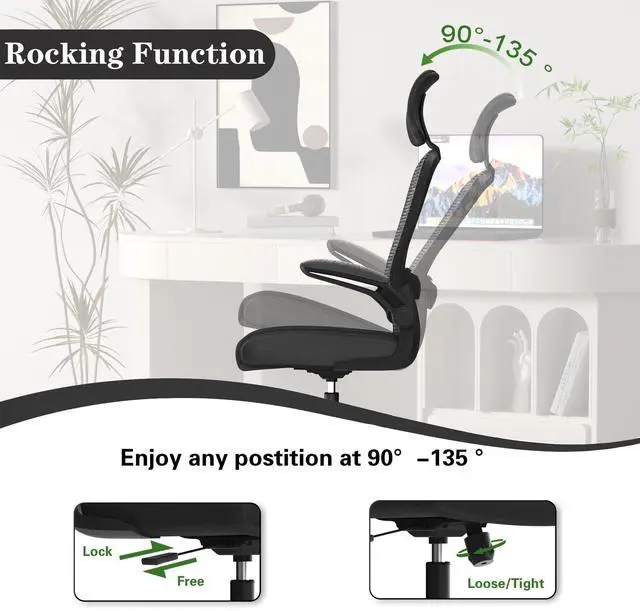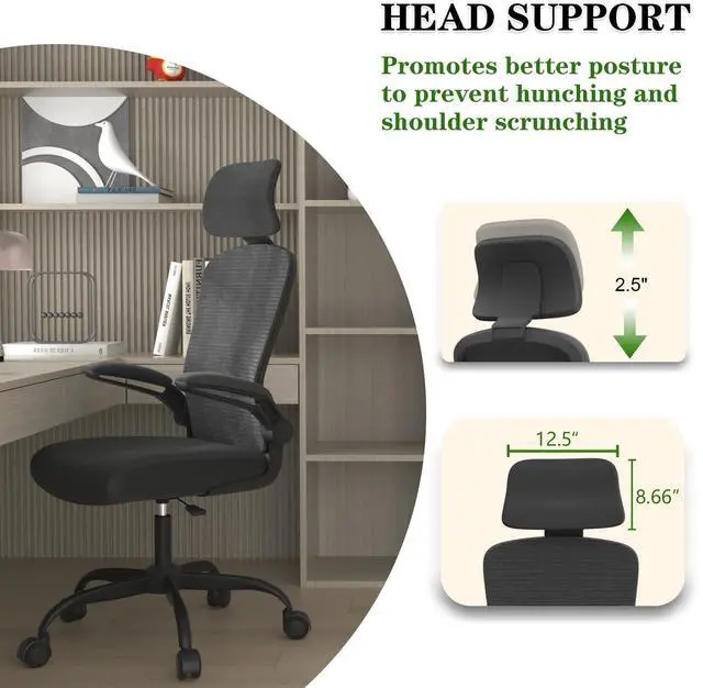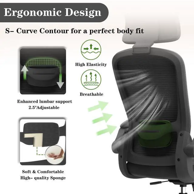 Ergonomic Mesh Office Chair, High Back Computer Desk Chair with Adjustable Lumbar Support & Headrest, Swivel Task Chair with Flip-Up Armrests for Home & Office
