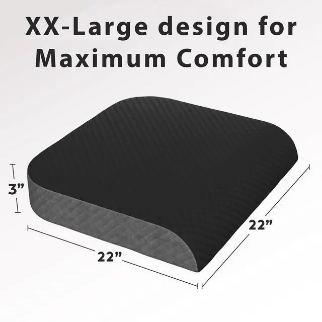 • DOUBLE EXTRA LARGE SIZE FOR EXTRA COMFORT: Make yourself comfortable. The Klbs XXL Large Seat Cushion is generously sized offering more width and more depth to provide padding and comfort for your seating surface. 22 inches wide x 22 inch depth and 3 inch height. Perfect Office chair seat cushion, floor cushion for meditation, gaming and more. Proper positioning makes this an ideal seat cushion for back pain and is a road trip must.