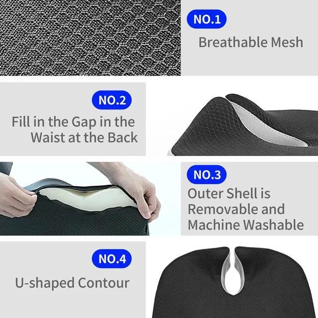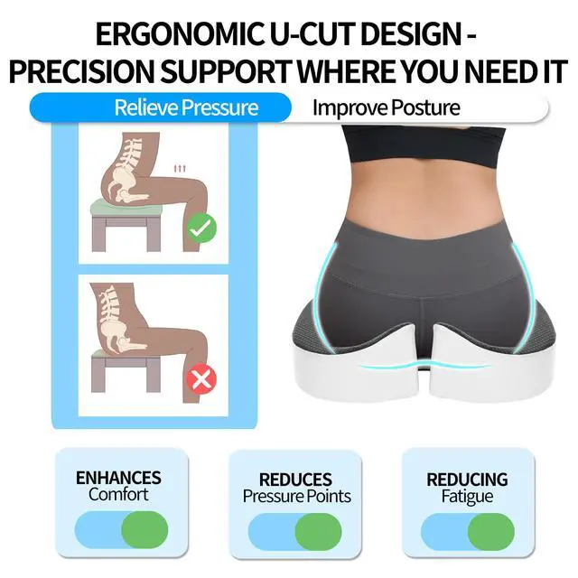 Ergonomic U-Cut Design for Office Comfort - Our office chair cushion features a deep U-cut to relieve tailbone pressure and minimize numbness. The raised bolsters and waterfall edge support your hips and thighs. This design ensures superior comfort for all your office chair sessions.