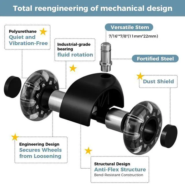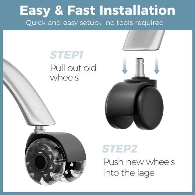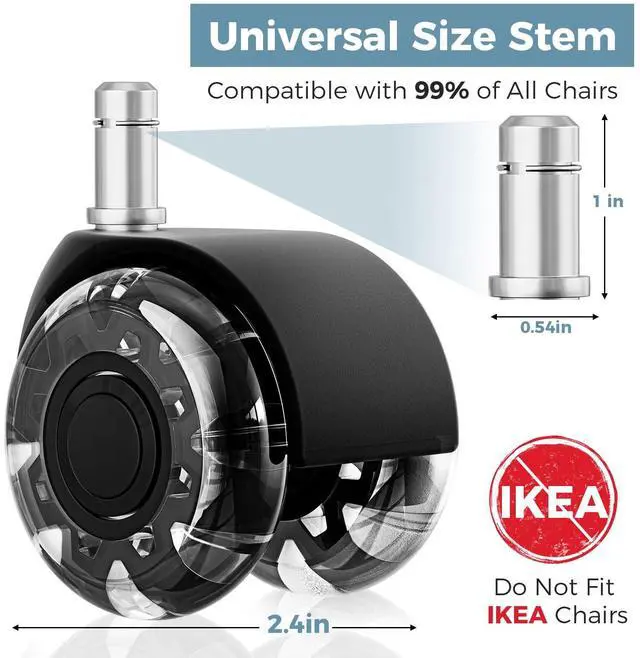 Universal Compatibility & Easy InstallationDesigned with a universal stem size of 7/16" x 7/8" (11mm x 22mm), these office chair wheels are compatible with 99% of office chairs. Installation is quick and tool-free, taking less than 2 minutes to complete. Note: Not compatible with IKEA chairs.