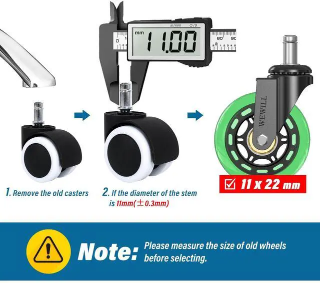 Universal Stem + Tool-Free InstallationFits the standard 7/16" x 7/8" (11×22mm) stem used by most office chairs. Not compatible with IKEA chairs and some brand-specific/off-brand modelsplease measure your current stem before ordering. Installs in minutes: pull out old wheels, push in new ones.