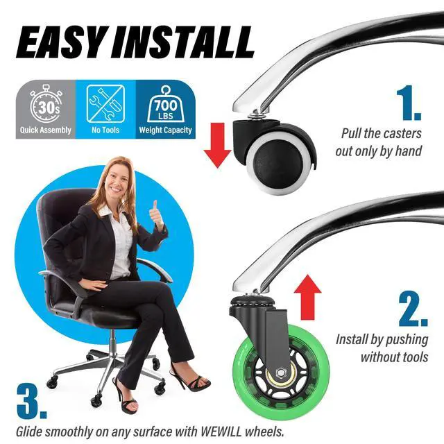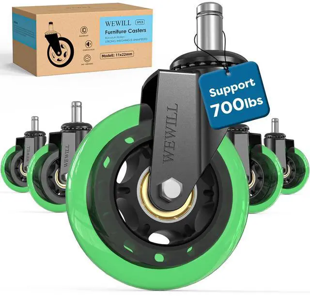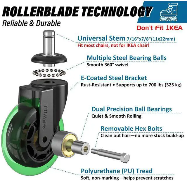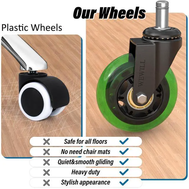 Upgraded Inline StyleSleek & StableWEWILL office chair wheels feature an upgraded inline-style design (not bulky twin plastic casters). The wider stance and smoother tracking help reduce wobble and improve chair stabilityan ideal modern upgrade for desk chairs.