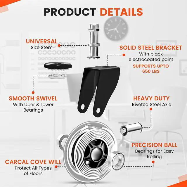 Experience the robust support of our replacement wheels for office chairs, designed to bear over 650 lbs, offering smooth and quiet rolling for any office chair wheel replacement needs.