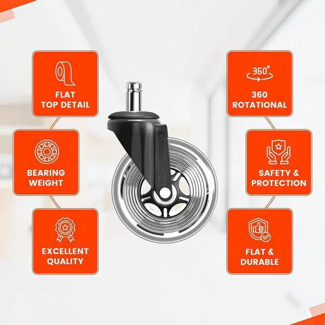 Our premium office chair wheels are safe for all floors, ensuring scratch-free and smooth rolling on hardwood, tile, carpet, and more. These high-quality chair casters provide ultimate protection and durability, making them perfect replacement wheels for any office chair.