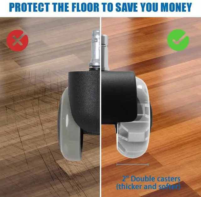 - These high quality office chair replacement wheels are encased in extra thick polyurethane (which will reduce the stress of rolling on your chairs) and will protect your floor from scratches and damage.