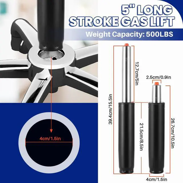 The office chair replacement cylinder, equipped with a gas lift, can support up to 500 lbs with a reliable and verified weight capacity.