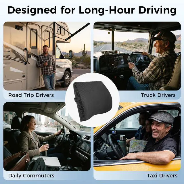 Lumbar Support Pillow for Car & Office Chair - High-Density Memory Foam Back Cushion for Sciatica & Lower Back Pain Relief - Non-Slip Support for Long Commutes & Desk Workers (Black)