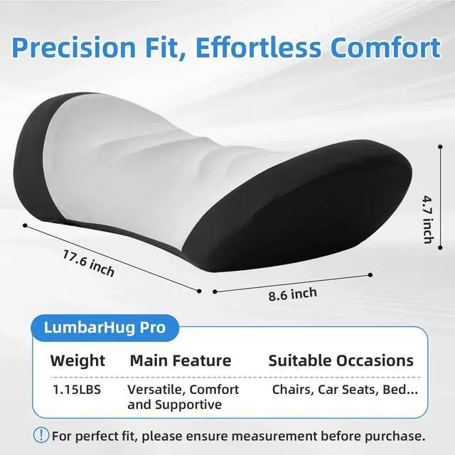 Meet the LumbarHug Pro—designed at 17.6" x 8.6" x 4.7" and weighing just 1.15 lbs for balanced, everyday support. Ideal for chairs, car seats, and even beds. Versatile, comfortable, and supportive.