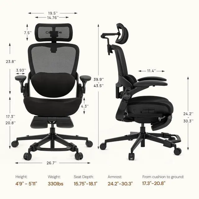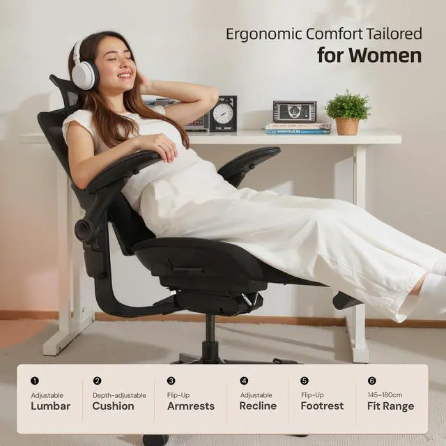 Discover comfort designed for petite and small-frame users with the CabLady S2 Ergonomic Office Chair. Unlike oversized office chairs that dont fit, this chair is engineered with a lower seat height, shorter seat depth, and adjustable low-position lumbar support to perfectly match smaller body types. The thick foam seat cushion and padded lumbar deliver softness and ergonomic stability, keeping you supported during long hours of work or study. For personalized comfort, the CabLady S2 features a one-touch recline with a side button, adjustable headrest, 3D armrests, extendable footrest, and leg support. Slim users from 4'7" to 5'11" can finally enjoy a chair that adapts to their exact needs. Its compact design with narrower armrest spacing and 90° flip-up arms saves valuable floor space, making it ideal for bedrooms, home offices, or small studios. Built with breathable fabric in a soft, modern style, this chair blends seamlessly with any workspace décor. Dual silent casters glide smoothly across hardwood floors, carpets, and tiles without noise. A sturdy white nylon 5-star base provides anti-tip stability and supports up to 330 lbs. Easy to assemble with illustrated instructions, this ergonomic chair delivers both beauty and durability. Certified by BIFMA and backed by patented design, the CabLady S2 proves that when it comes to petite comfortfocus creates professionalism.