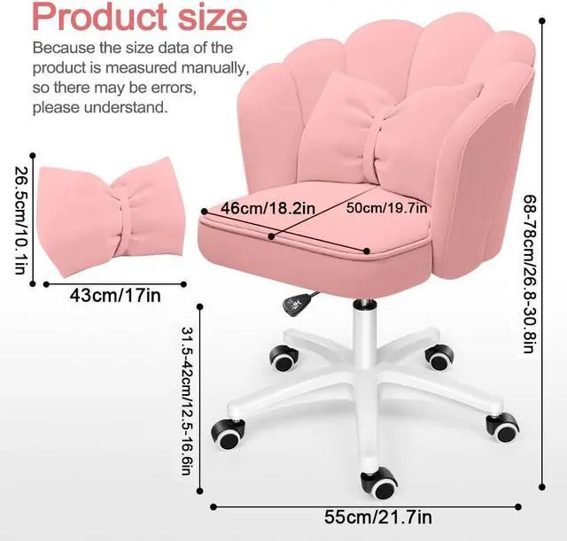 Charming Bow-Tied Cushion for a Touch of WhimsyThis office chair doesn' t just offer comfortit adds a playful, feminine touch to your space. The cute bow-tied cushion, delicately petal design at the back, creates a charming, decorative look that' s perfect for enhancing your vanity or desk area. Suitable for bedroom, dressing room, living room, office, study, etc. It' s a nice gift for family or friends. Especially for lady and girls.