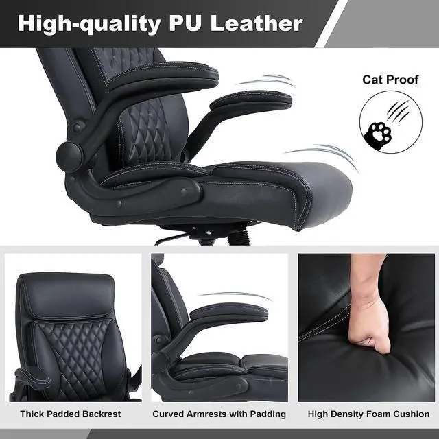 [Adjustable Features]: Pneumatic seat height adjustment, 20°tilt, 90° flip-up armrests, and 360° swivel. Able to rock back 110° to help you relax. With the foldaway arms, the executive chair can easily slide under a desk for space-saving. Adjustability options allow you to customize the perfect setting to fit your body comfortably.