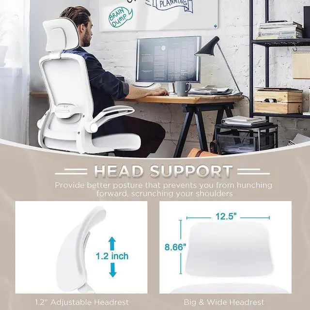 [! ] Designed to maintain a natural S-curve in your spine, reducing back pain and fatigue. Our adjustable lumbar support adapts to your movements, minimizing strain on the lumbar discs. The adjustable headrest prevents you from hunching forward, scrunching your shoulders.,!