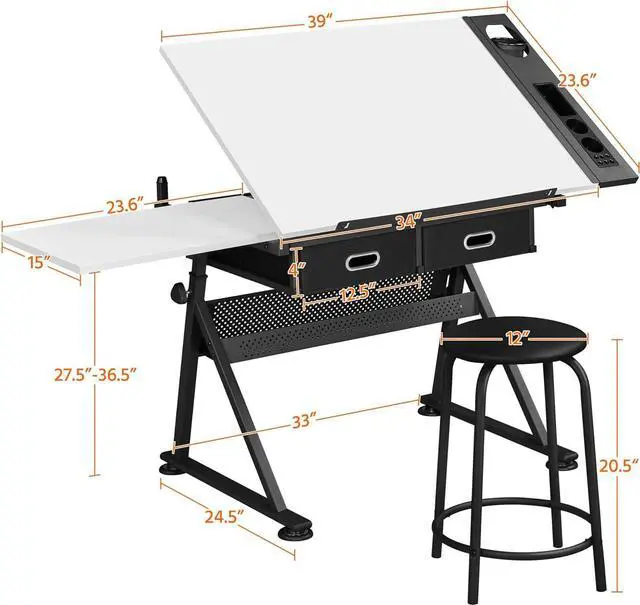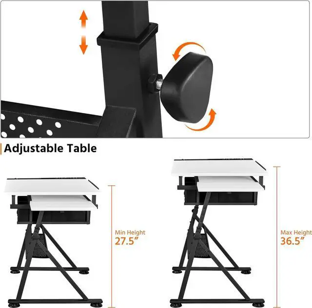 Heavy-duty Construction: This sturdy art desk with storage is crafted of a powder-coated metal frame and MDF desktop with waterproof and scratch-proof veneer. The substantial materials ensure a high load capacity of up to 100 kg/ 220 lb